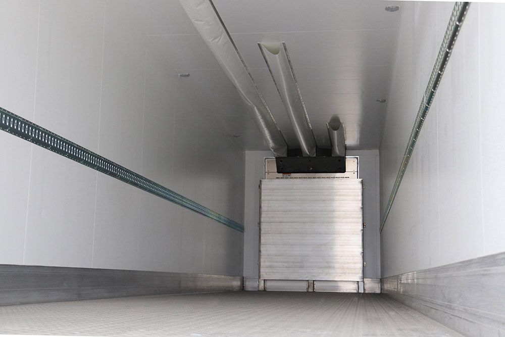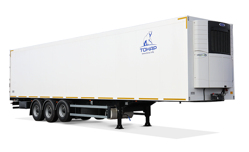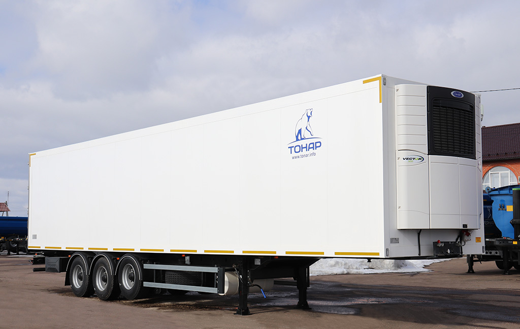Полуприцеп изотермический. Объём кузова 92 куб.м. 3 оси. Полуприцеп отвечает всем европейским требованиям по массе и габаритам, длина автопоезда не превышает 18,75 м.