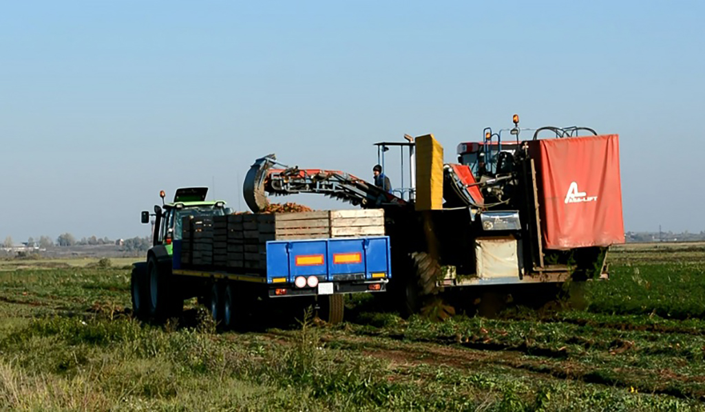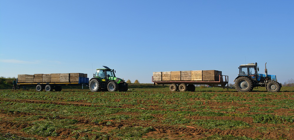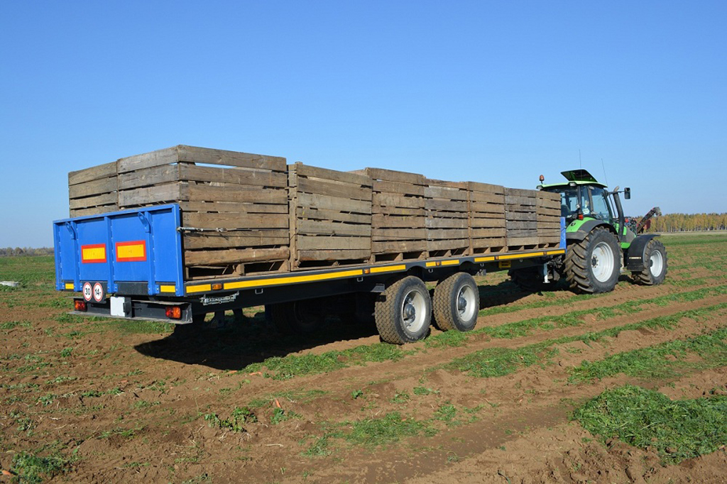 Прицеп тракторный, предназначен для перевозки овощных контейнеров и цилиндрических тюков сена (соломы).