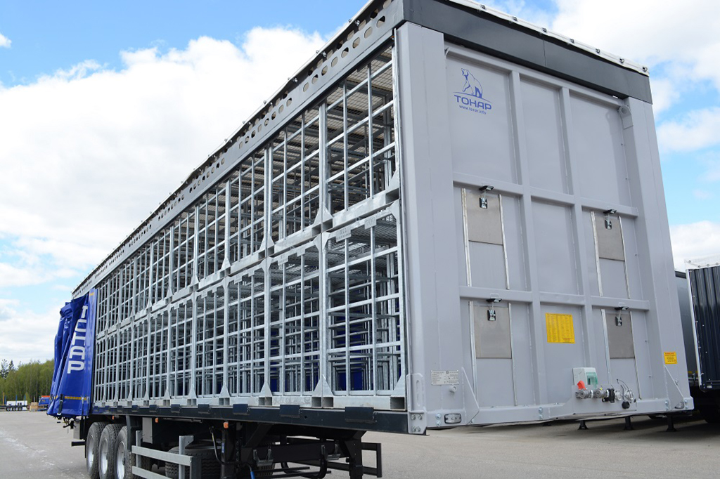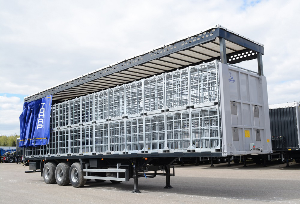 Тентовый полуприцеп с подъемной крышей и сдвижными боковинами для перевозки птиц на убой, в металлических контейнерах различных производителей.
